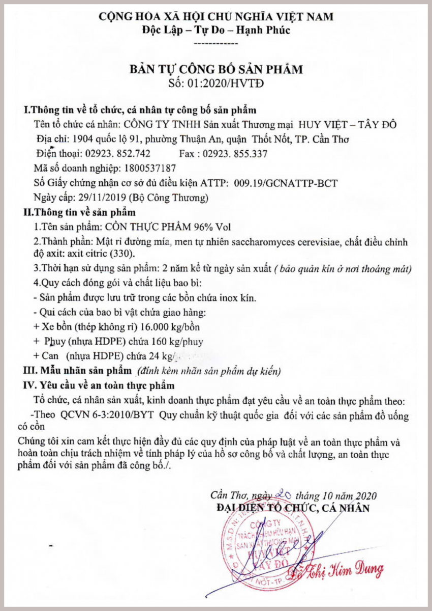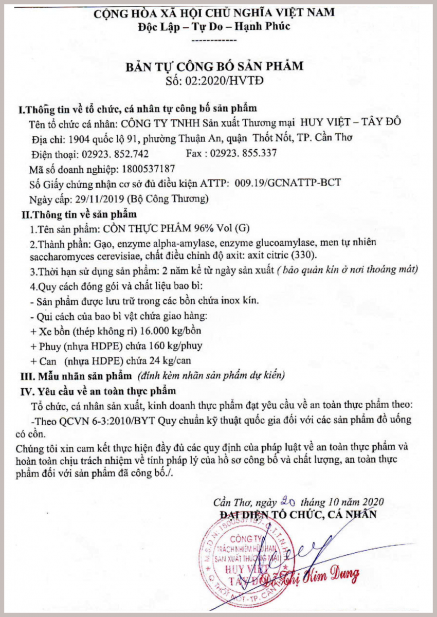 CHỨNG NHẬN SẢN XUẤT CỒN THỰC PHẨM